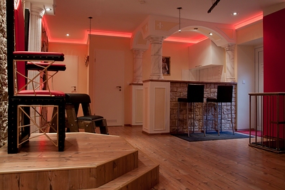 Barbereich: mit kleiner Küche (komplett eingerichtet), Sitzecke mit Klappsofa 180cm, Dominathron auf Podest, Spankbock, Käfig, Spinnennetz, Spreizstuhl, Soundanlage und Fernsehen