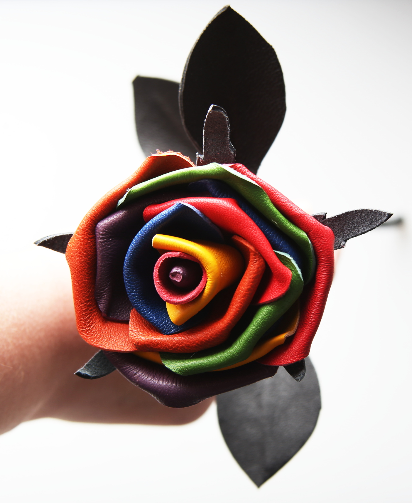 Produktinformationen "Leder Rose - Regenbogen - schwarze Blätter"