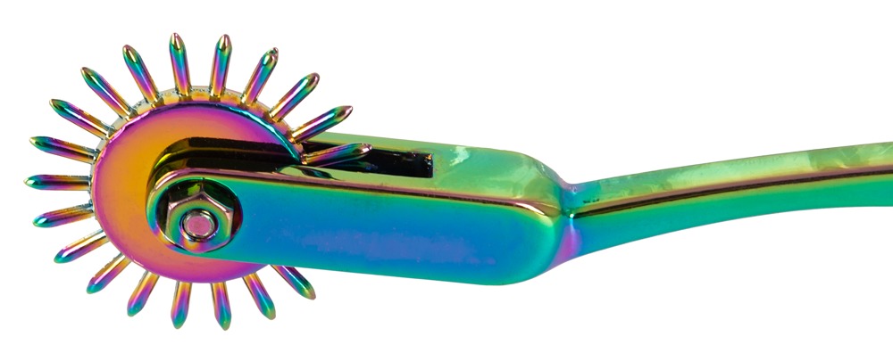 Robustes Metall-Nervenrad Rainbow Single Pinwheel von fetish collection in edel schillernden Regenbogenfarben. Es wird mit mehr oder weniger Druck über die Haut gerollt und verursacht dabei entweder sanft stimulierende Gefühle oder intensiven lustvollen Schmerz. Das mit kleinen sehr spitzen Nadeln besetzten Rädchen kann überall am Körper zum Einsatz kommen. Der lange schmale Griff liegt dabei gut in der Hand und sorgt für optimale Führung und variabel leicht auszuübenden Druck.