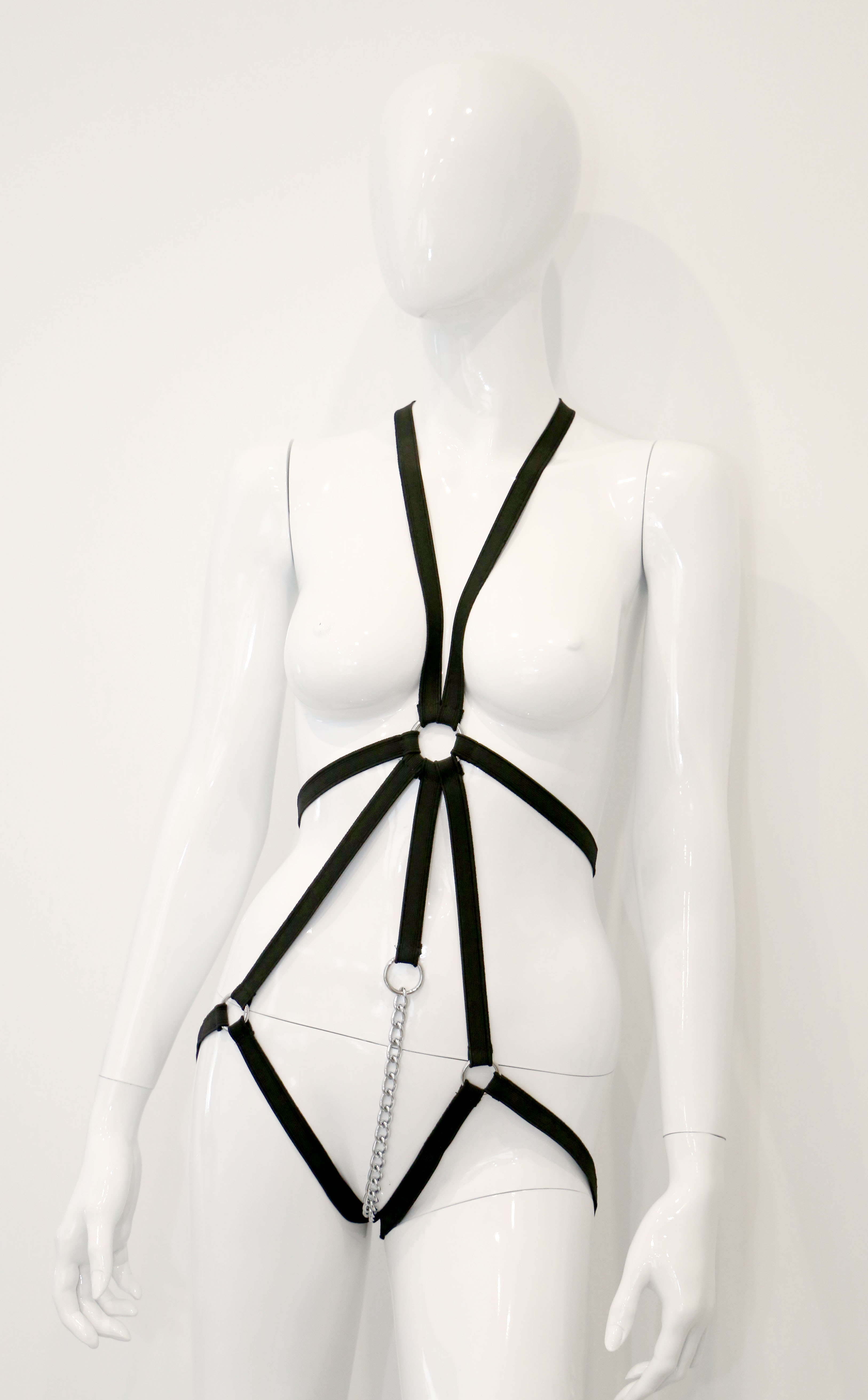 Harnes aus elastischen Gummibändern mit Kette die durch den Schritt führt