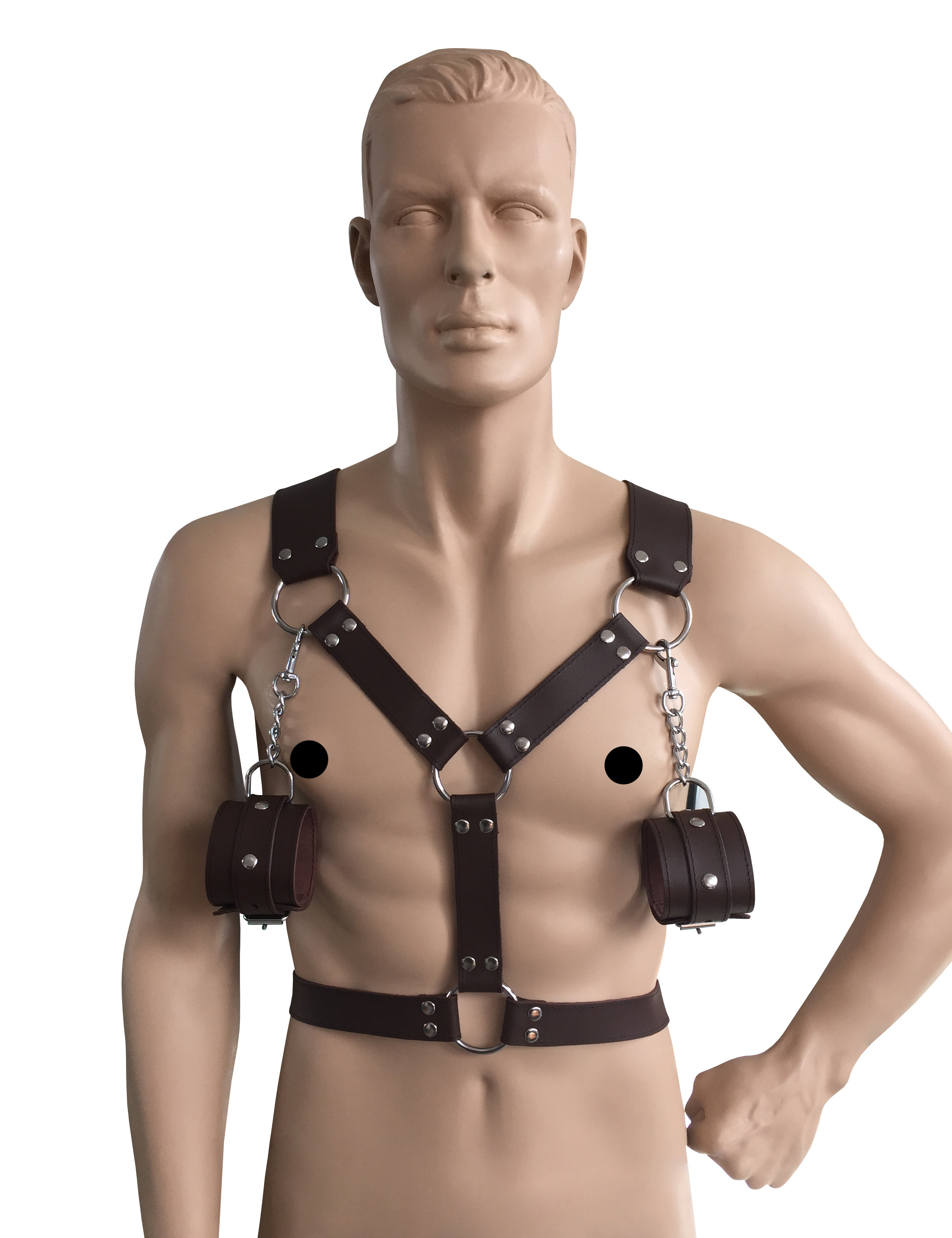 Harness und Handfesseln aus robustem Leder mit Karabinerhaken.